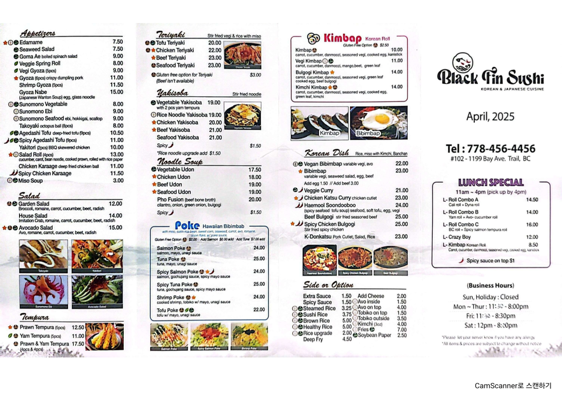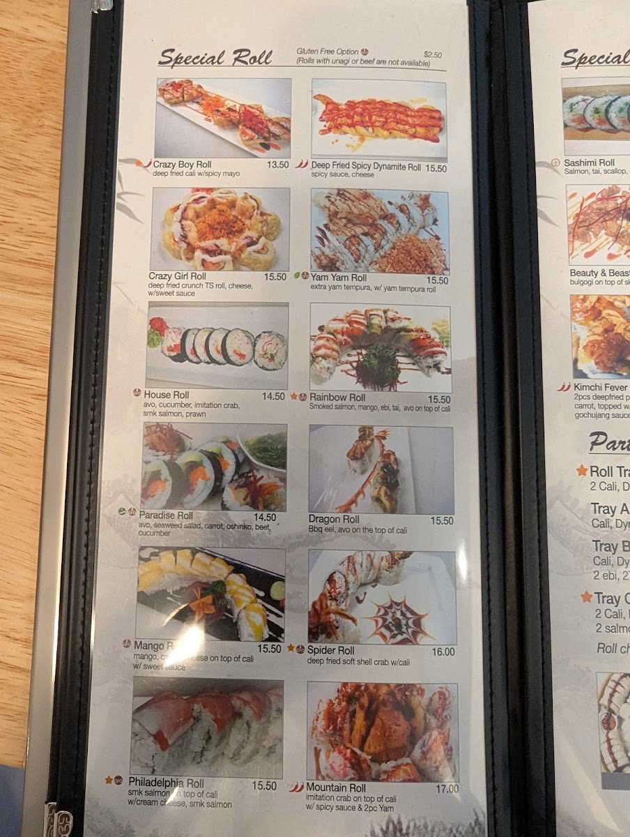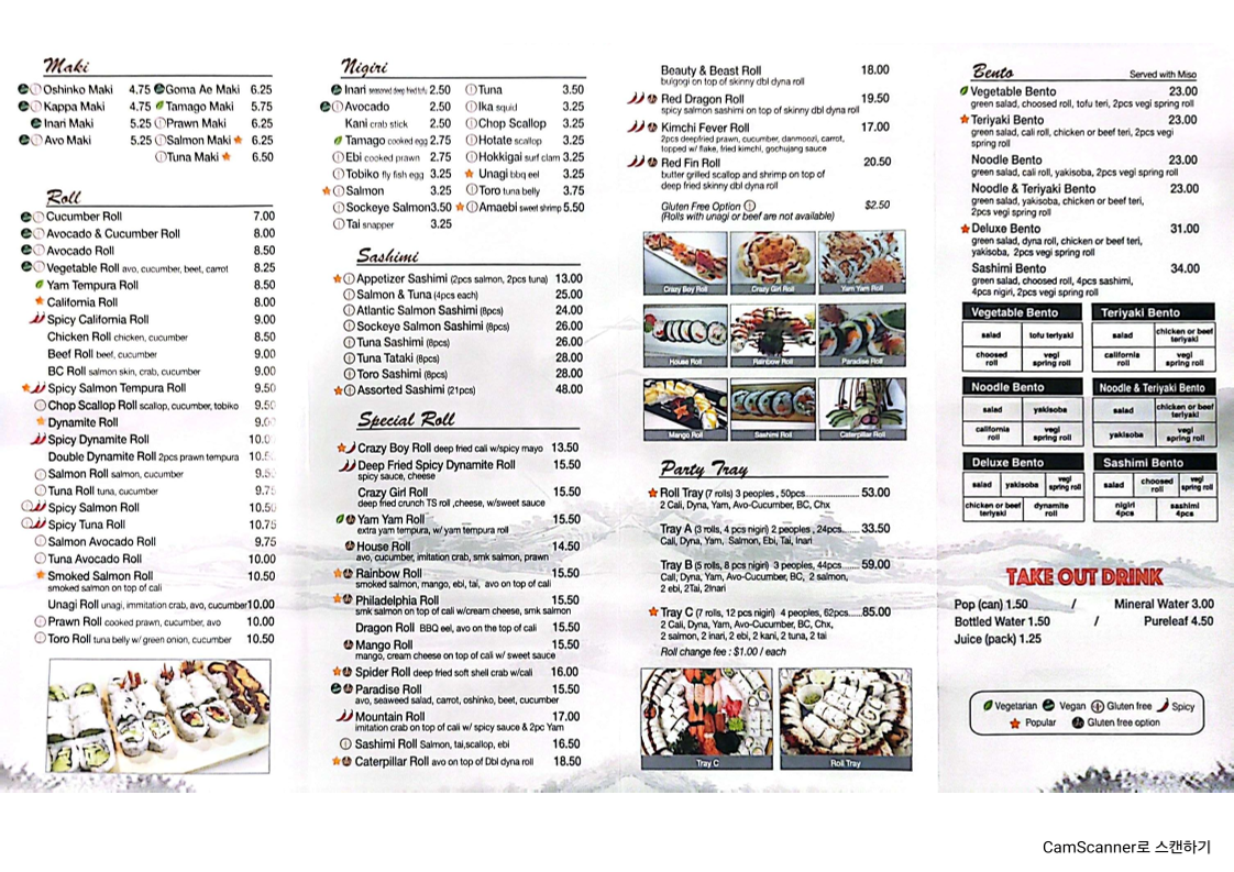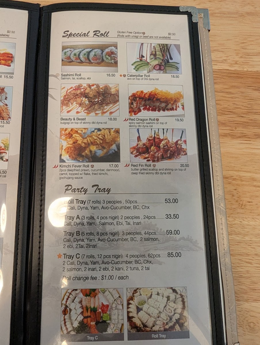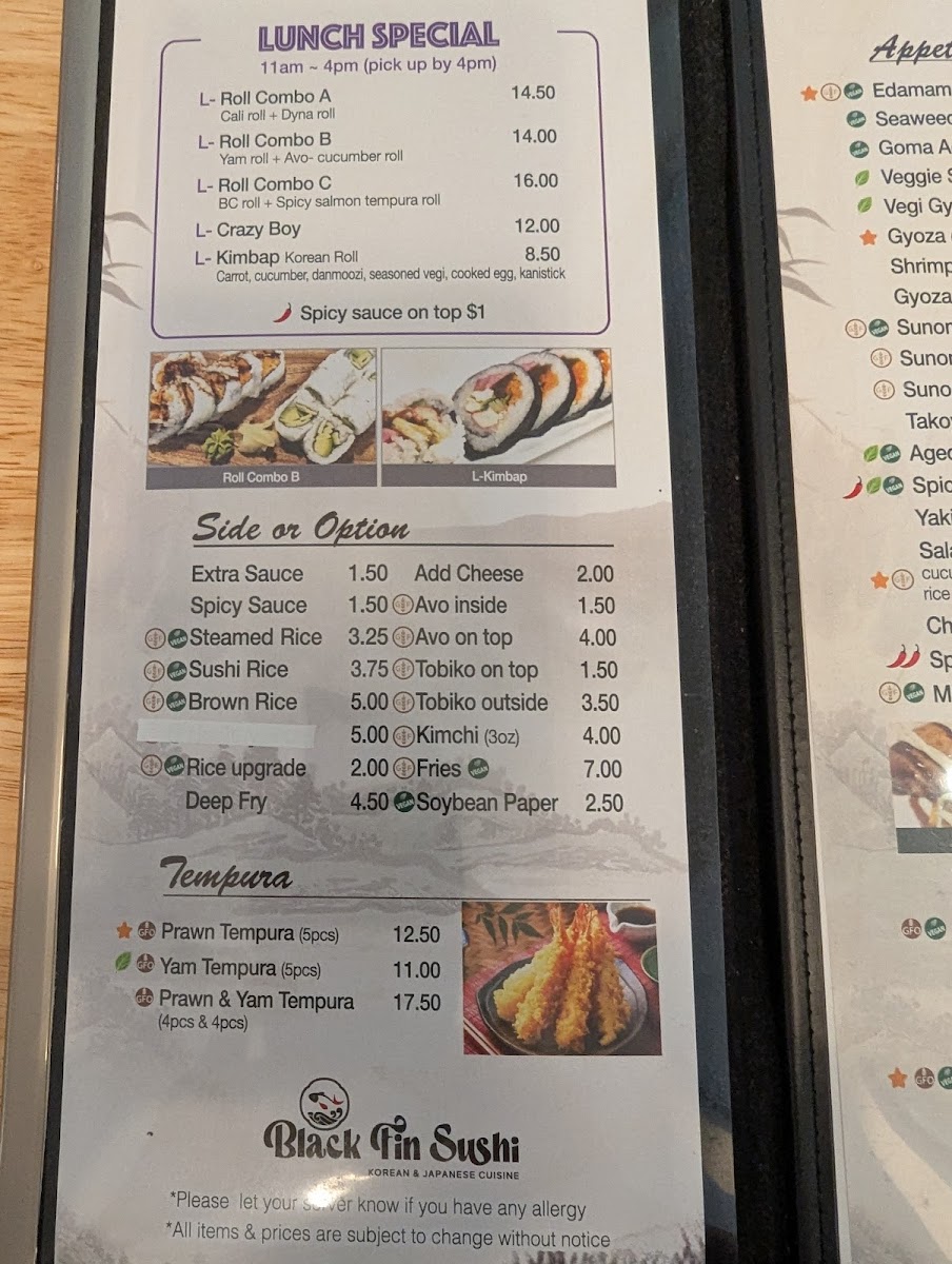 The menu at Black Fin Sushi offers a wide range of delicious options, catering to various tastes. For those seeking specialty rolls, choices like the Crazy Boy Roll, Deep Fried Spicy Dynamite Roll, and Crazy Girl Roll are standout items. The Yam Yam Roll and House Roll also make for flavorful options. The sashimi selection includes fresh options such as Appetizer Sashimi, Salmon & Tuna, and Sockeye Salmon Sashimi. Maki enthusiasts will appreciate the classic options like Oshinko Maki, Kappa Maki, and Avo Maki, along with more unique choices like Goma Ae Maki. The nigiri offerings feature Inari, Avocado, Kani Crab Stick, Tamago, and Ebi. Bento lovers can enjoy a variety of meals including the Vegetable Bento, Teriyaki Bento, and the more filling Deluxe Bento. For takeout, the restaurant provides refreshing drinks such as Pop (can), Bottled Water, and Pureleaf. The roll section includes lighter options like the Cucumber Roll and Avocado Roll, as well as the hearty Yam Tempura Roll. For larger groups, there are several Party Tray options like Tray A, Tray B, and Tray C. Those seeking something a bit different can try the Beauty & Beast Roll, Red Dragon Roll, or Kimchi Fever Roll, with the added convenience of a Gluten Free Option available for select dishes. With such a diverse menu, Black Fin Sushi caters to both traditional sushi lovers and those in search of bold new flavors.